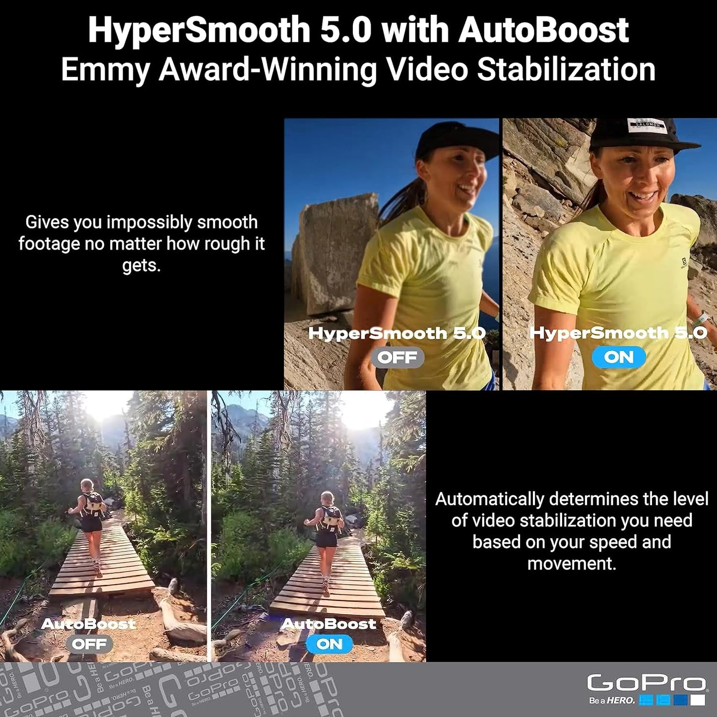 Ganadora de un Emmy en 2021, la tecnología HyperSmooth 5.0 brinda una estabilidad sin precedentes. Ya sea en deportes extremos, ciclismo, running o tomas desde vehículos, tus videos se mantendrán estables, sin vibraciones. La función Horizon Lock mantiene el horizonte nivelado incluso cuando la cámara rota completamente.