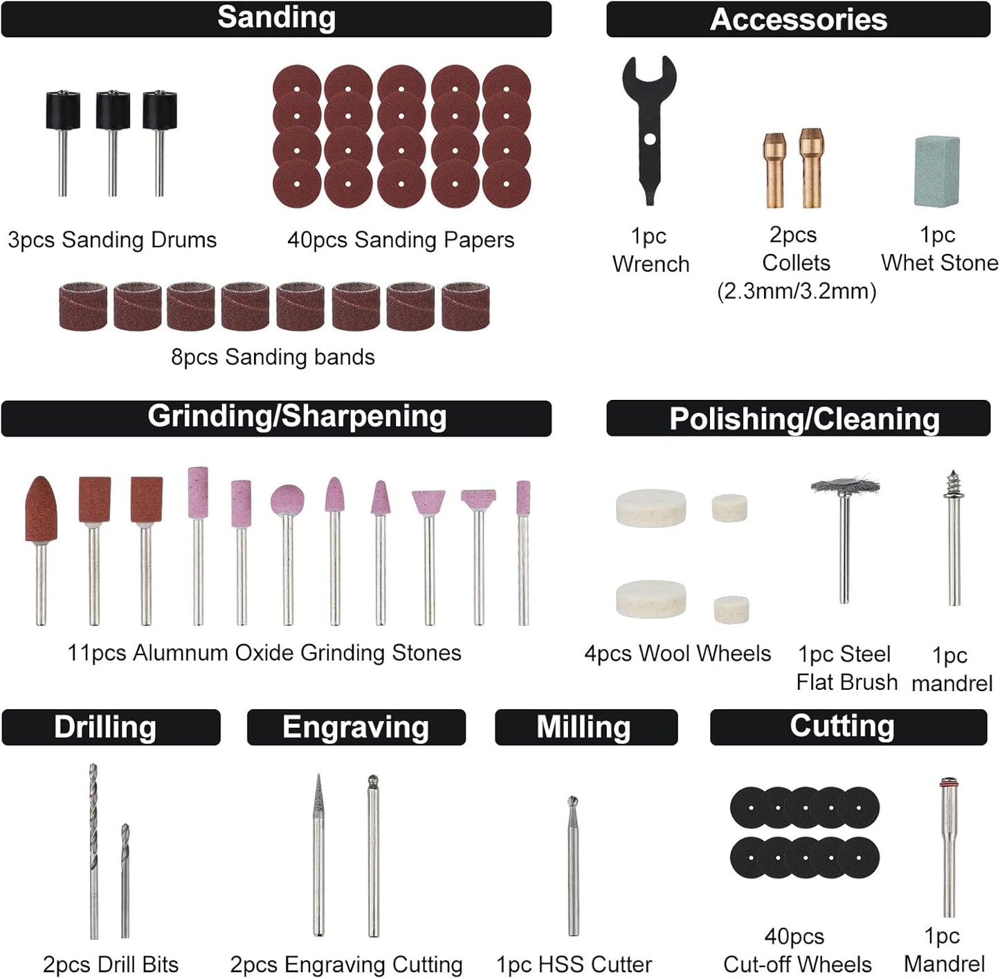 Compatibilidad universal: cuenta con portabrocas de 3/32" y 1/8”, compatible con la mayoría de accesorios de herramientas rotativas del mercado.