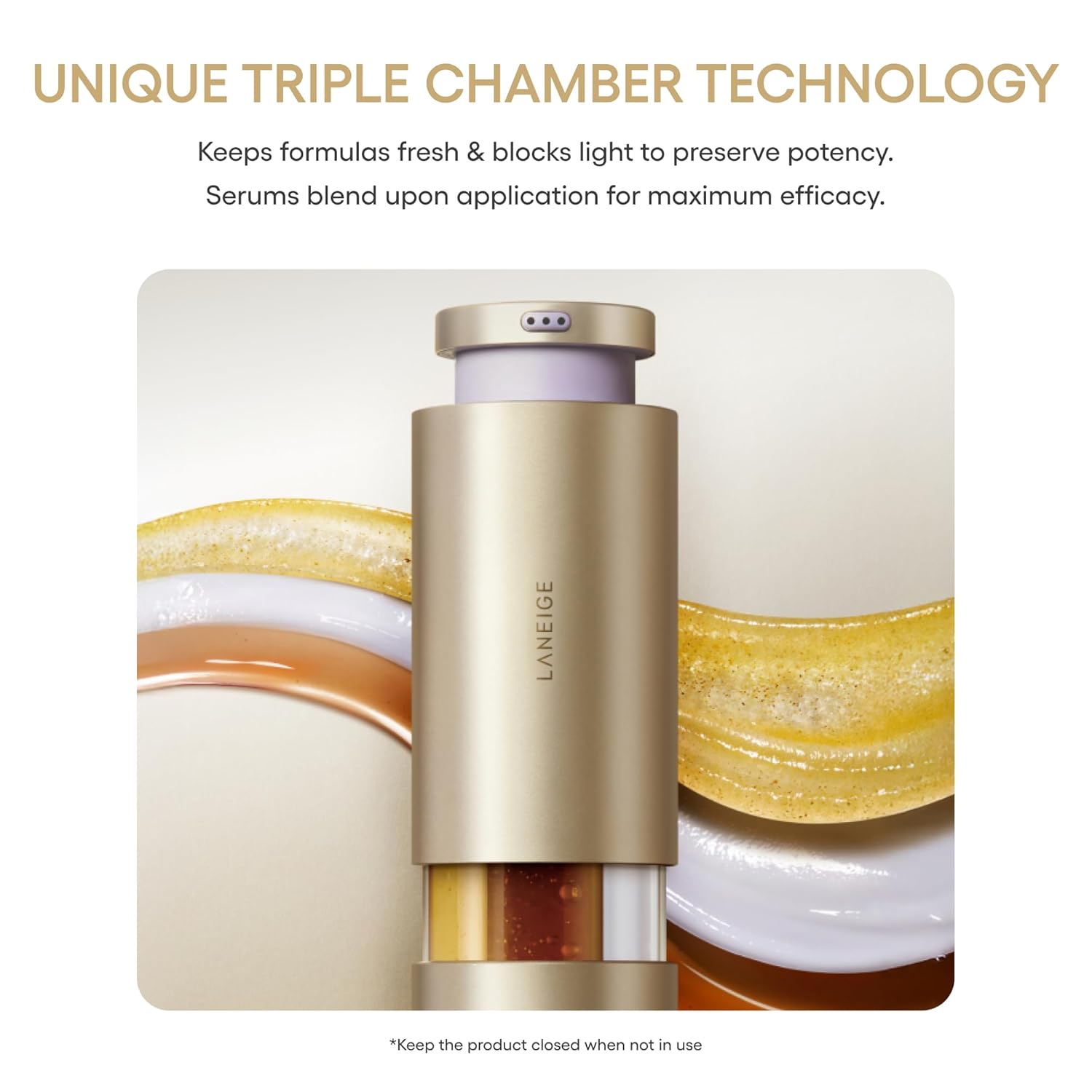 Tres sueros suaves se dirigen a la piel tres formas de mejorar las líneas finas, la firmeza y el brillo. El exclusivo embalaje de triple cámara bloquea la luz para ayudar a mantener las fórmulas frescas y potentes mientras no están en uso. El embalaje puede variar.