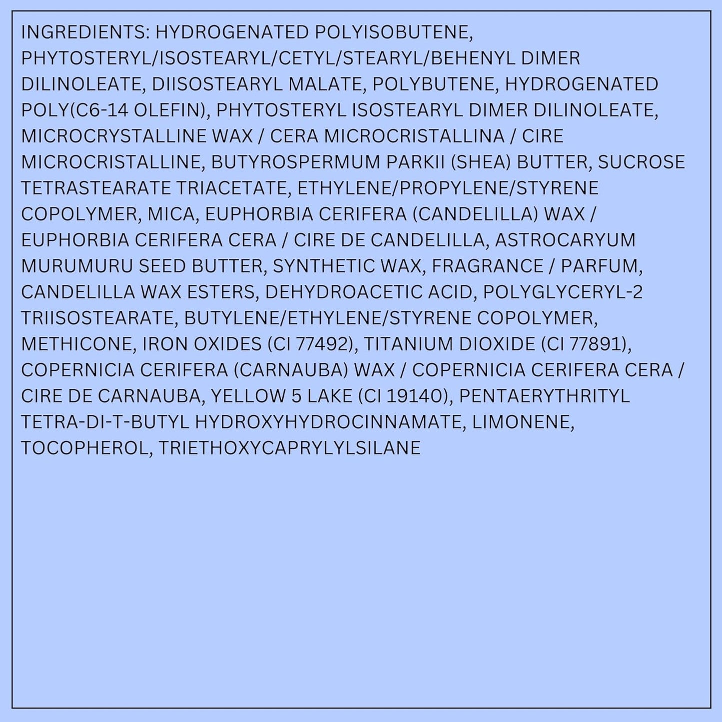 Manteca de Karité (Shea Butter): rica en lípidos emolientes; contribuye a nutrir, suavizar y mantener la hidratación en la superficie del labio.